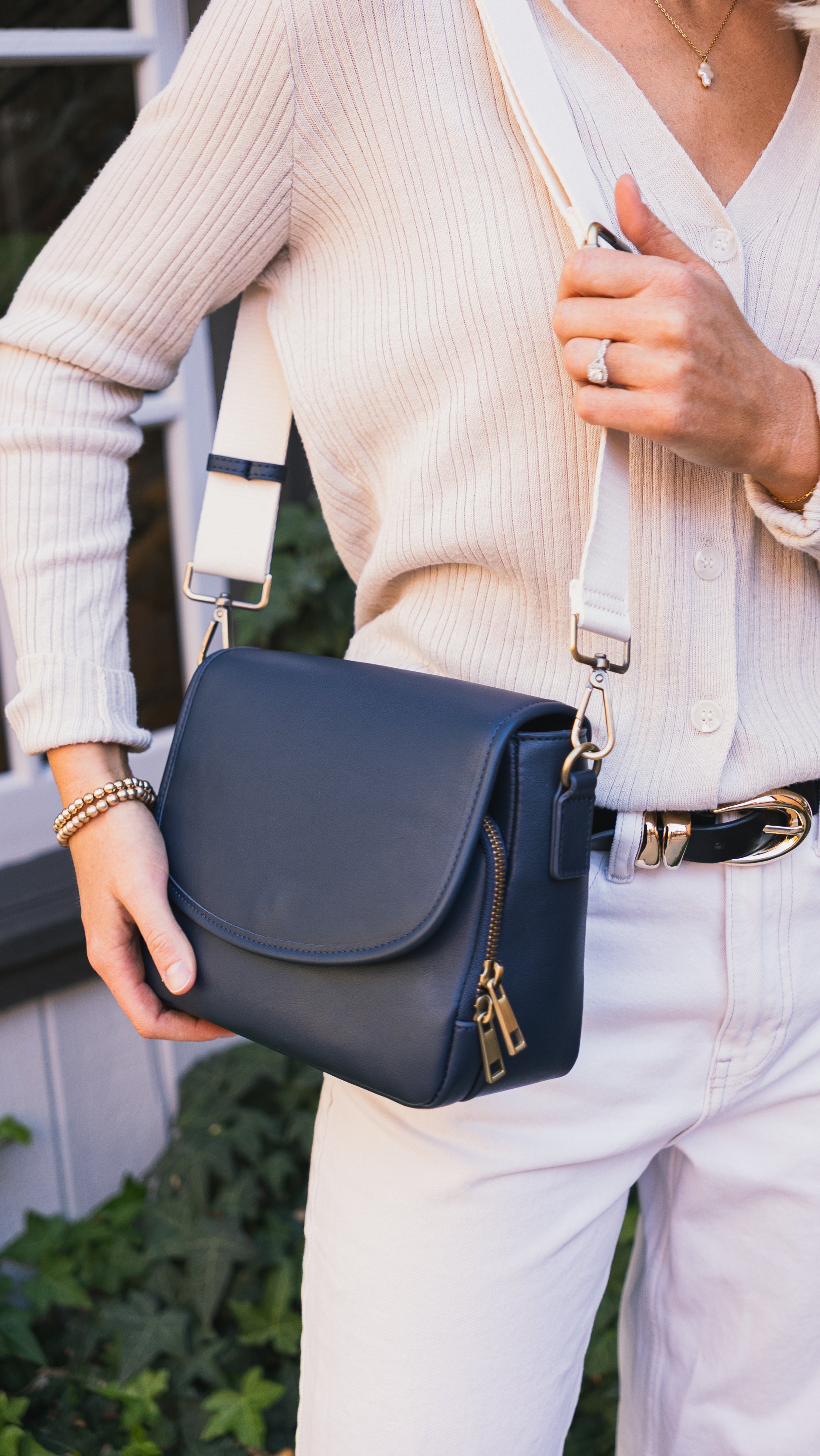 - Cream strap included