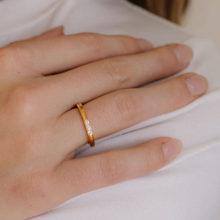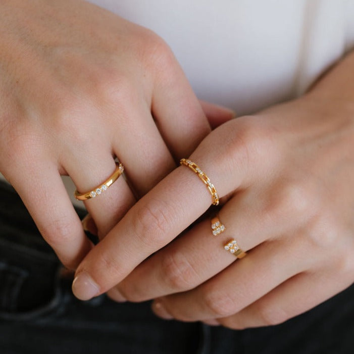 Introducing our stunning Vermeil Gold and Silver Spaced CZ Cluster Ring! This exquisite piece is the perfect combination of elegance and versatility. Crafted in high-quality 18k Vermeil gold or Silver, with CZ White stone, these rings are water proof, and sweat proof.